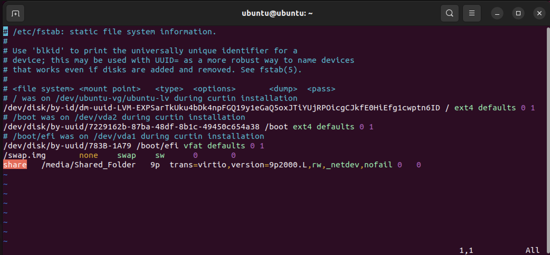 share /media/공유폴더이름 9p trans=virtio,version=9p2000.L,rw,_netdev,nofail 0 0