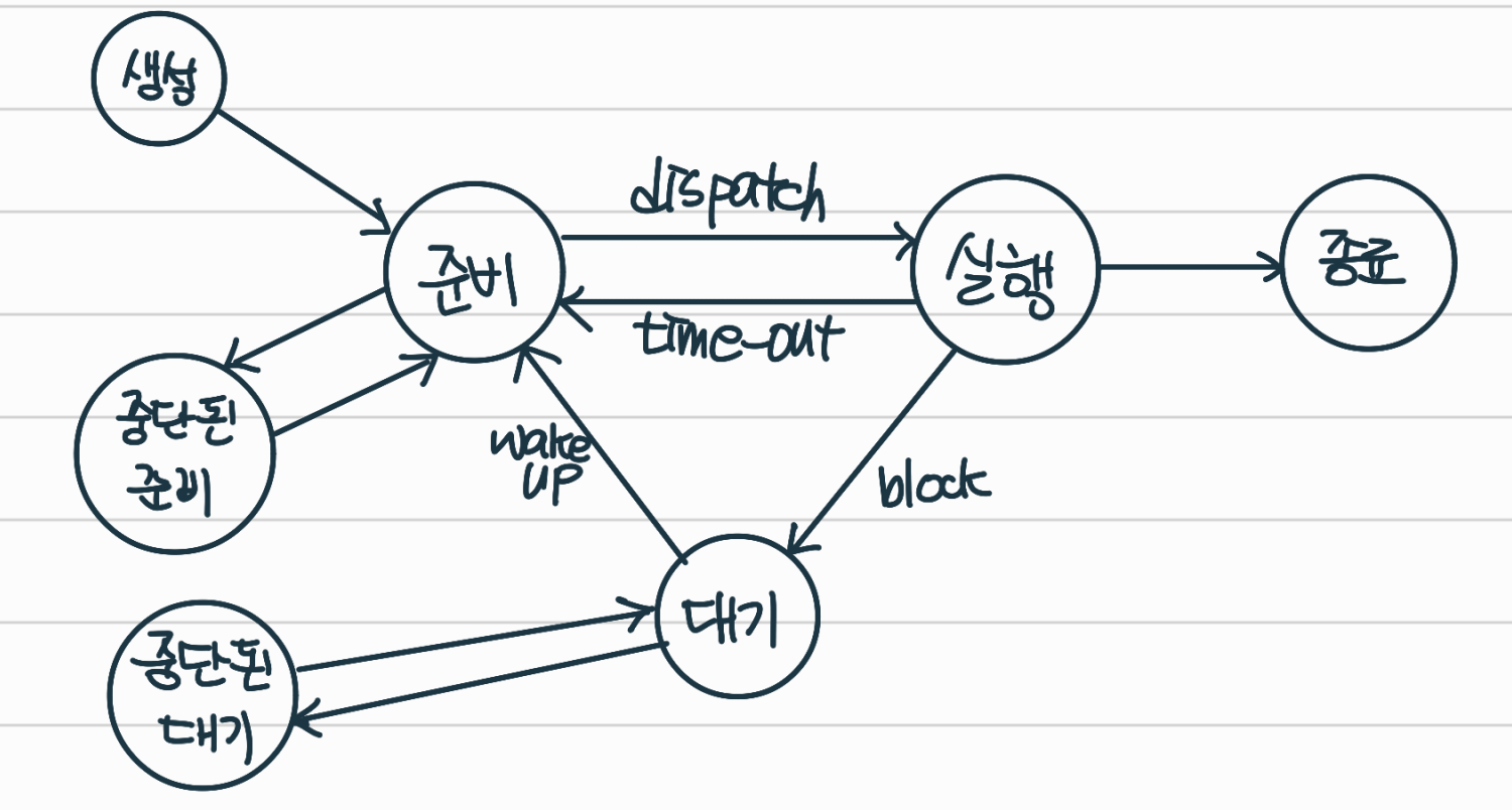 - 프로세스의 상태도와 같은 상태를 가짐.