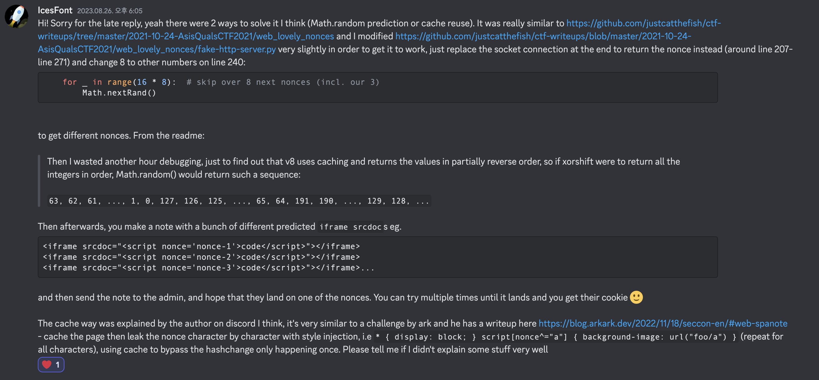 브라우저 캐싱을 이용한 방법인데, CSS Injection을 통해서 한번에 하나의 Script Nonce를 뽑아낼 수 있었다.