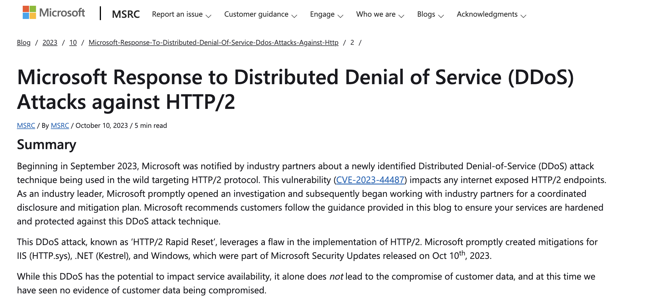 Summary Summary Beginning in September 2023, Microsoft was notified by industry partners about a newly identified Distributed Denial-of-Service (DDoS) attack technique being used in the wild targeting HTTP/2 protocol. This vulnerability (CVE-2023-44487) im