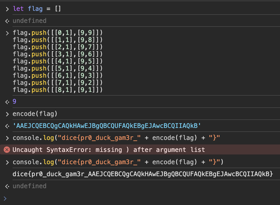 You can see that the type of flag is dice{pr0_duck_gam3r_ encode(history) }