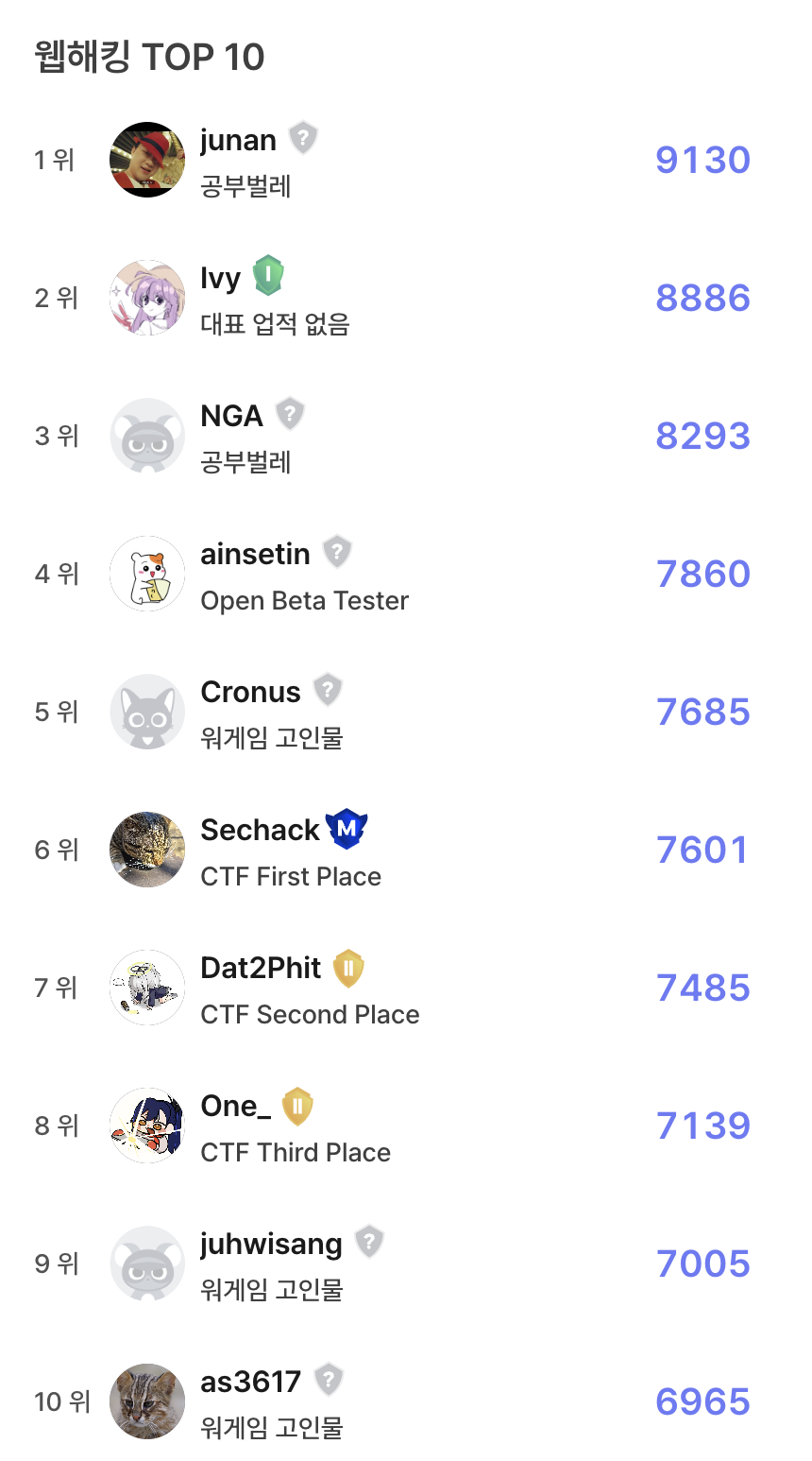 물론 해당 순위가 절대적인 웹 해킹 실력의 지표는 아닐 뿐더러, 나보다 점수가 낮음에도 나보다 웹 해킹을 잘하는 사람은 분명히 많을 것을 알고있다.