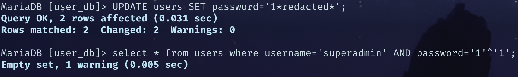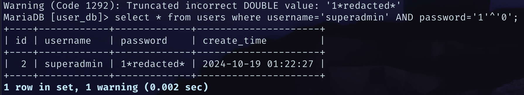 이 값을 '1'^'1'과 비교하였기 때문에 로컬에선 superadmin 로그인에 성공한 것이었다.